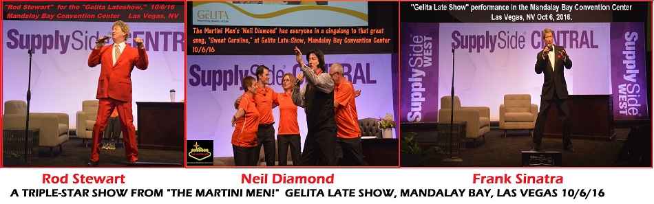 Past Highlights: Thursday 10/6/16,"The Martini Men's Rod Stewart, Neil Diamond and Frank Sinatra" had a great time entertaining for the "Gelita Late Show" at the huge Supply Side West trade show in the Mandalay Bay Convention Center, Las Vegas, NV.  Ready to add some Las Vegas-style glamour to your event, nationally!