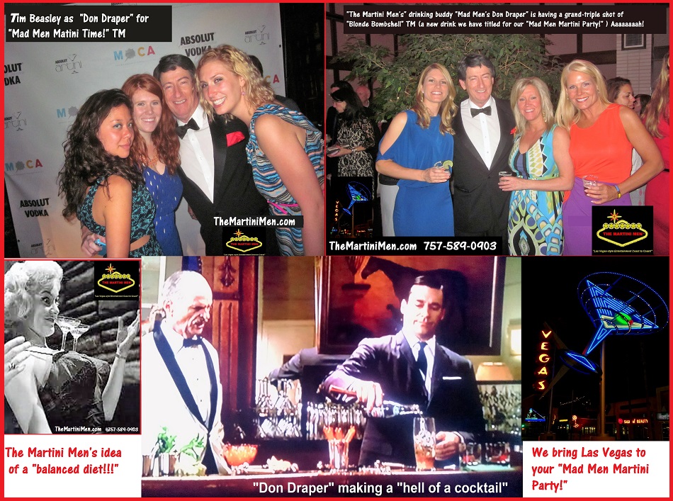 ....and now, back to our "Martini & Las Vegas-style" shows for your "Parties Anytime, Anywhere!" We even have specific OPTIONAL themes, like our 1960's flavored "Mad-Men Martini Shows" illustrated in these montage photos featuring our very own "Dean Martin" doubles as "Mad-Man Don Draper" as the MC for your glamour bash, Hi-Fi fashion social mixers!!!