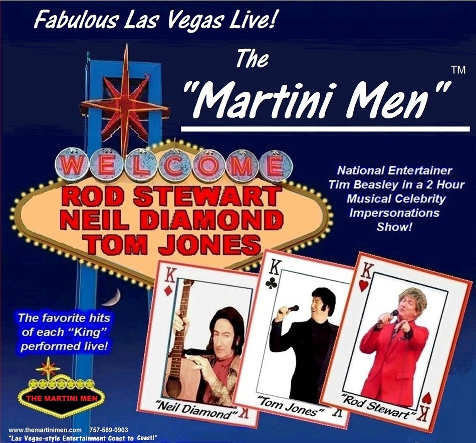 Nothing beats the great sounds of classic and cool Las Vegas, and "The Martini Men” TM  feature the full tribute-impersonations performances  as "Frank Sinatra, Dean Martin, Bobby Darin, Tony Bennett, Andy Williams, Paul Anka," and the "younger guys" Rod Stewart, Neil Diamond, Billy Joel, Engelbert Humperdinck  and Tom Jones" in a glamorous and high-energy exciting Las Vegas-style-show!